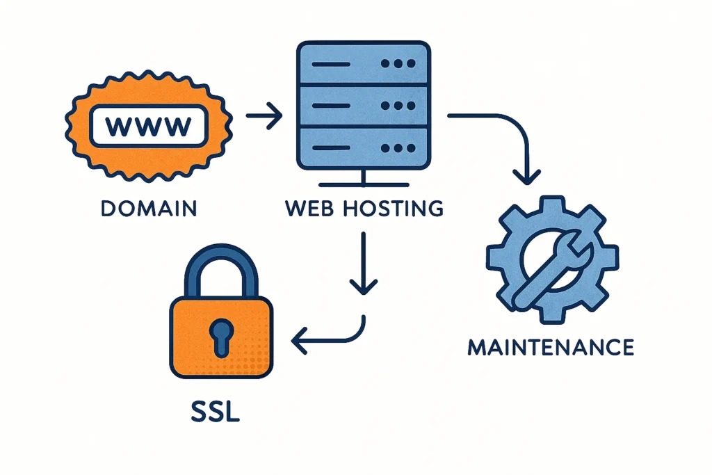 Domain Name — This is your website address, like yourbusiness.com. Domain registration cost in Pakistan runs around PKR 2,500 to PKR 5,000 per year. A .com domain is the most trusted and popular choice. A .pk domain is slightly cheaper and works well for businesses targeting local Pakistani audiences specifically.